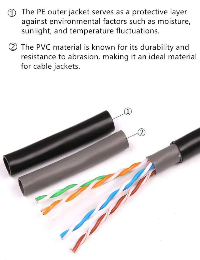 The Dual Jackets (PVC+LLDPE) Cat6 Bulk 300ft Ethernet Cable is a high-quality networking cable designed for both outdoor and indoor installations. With its double-layer protection, the cable can withstand direct sunlight, extreme cold, and high humidity, making it a reliable choice for any weather conditions. Featuring a UV-resistant LLDPE weather jacket and PVC inner jacket, the cable provides a strong and durable shield against harsh environmental factors. Additionally, its flexible core design ensures the cable won't bend or break, even in the harshest environments. Made with copper-clad aluminium wire, this Cat6 cable delivers high-speed connectivity with 4-pair unshielded twisted pair (UTP) cables.