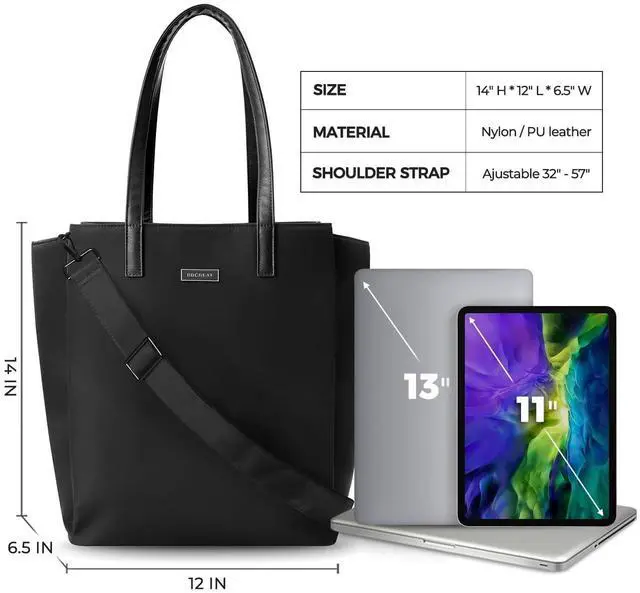 Storage: Measuring 14" H 12" L 6.5" W, this laptop tote bag for women offers a spacious main compartment for daily essentials, while the side sleeve securely fits laptops or tablets up to 13". Designed for work, campus, or commuting. (For your shopping pleasure, please check whether your electronic products are suitable in size. ) ^^ Chic Panel Design with