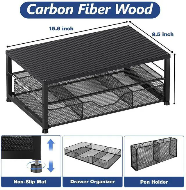 Ergonomic DesignOPNICE newly releases the monitor stand for desk organizer! This computer stand elevates your monitor or laptop to a comfortable viewing height, relieving pressure on your neck, shoulders. Ideal for strengthening office organization and increasing comfort levels ^^ Save SpaceThis 2-Tier monitor stand with drawer and 2 hanging pen holders provides ample storage space to keep your office supplies and office desk accessories neatly organized and easily accessible, keeping your workspace tidy and improving your sense of well-being ^^ Durable and StableThe metal computer stand is made of high quality material with sturdy construction, it can easily carry the weight of the display and computer accessories, to ensure stable and non-shaking for a long time, ideal for use in the office, dorm room or home ^^ Sleek and AestheticThis desktop organizer features a modern minimalist design that blends seamlessly with any office decor.