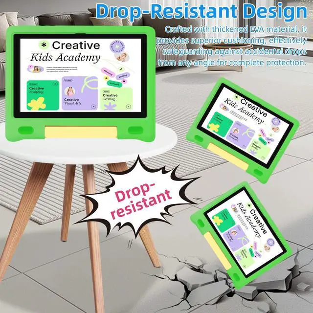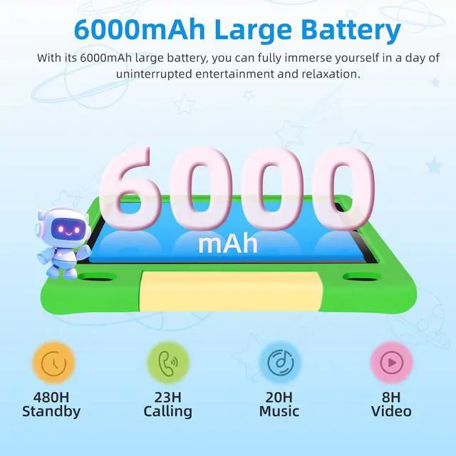 LONG-LASTING BATTERY & CHILD-SAFE DESIGN: Featuring a high-capacity 6000mAh battery, this kids tablet provides up to 12 hours of continuous use on a single charge, making it ideal for long road trips, flights, or all-day learning. Encased in a sturdy, shock-resistant EVA protective case, and with a 2-year replacement warranty, its built for durability and worry-free handling, making it safe for active children aged 3-12. ^^ EYE-COMFORTING 10.1 -INCH