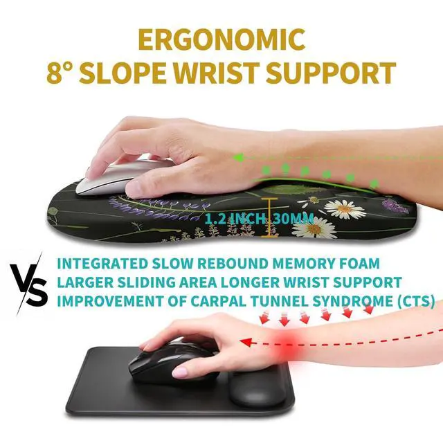 Ergonomic SlopThe ergonomic 8-degree massage slope design can improve carpal tunnel syndrome, alleviate wrist pain, and keep the wrist in the most comfortable state. ^^ Cursor PositioningLycra fabric has a smooth surface without pilling and accurate positioning, allowing everyone to work comfortably. Suitable for wireless mice and other types of mice. ^^ Massage ReboundHigh quality integrated molding with slow rebound memory foam, not easily deformed. The massage raised slope design enhances air circulation between the wrist and mouse pad, preventing sweating. ^^ Size 11.8 x 7.9 x 1.2 inches (300x200x30mm), with a larger sliding area and all-round wrist support, perfect for right-hand or left-hand use.