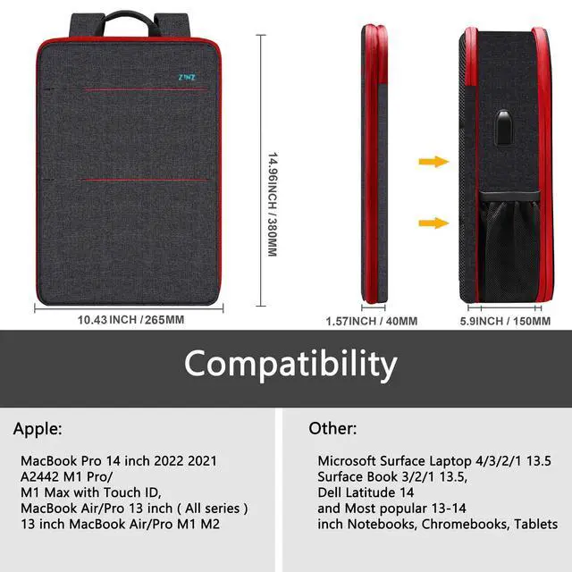 The laptop backpack exterior dimensions: 14.96 x 10.43 x 1.57 / 5.51 inches (L x W x H), interior: 14.37 x 9.65 x 1.38 / 5.31 inches (L x W x H); Compatible for MacBook Pro 14 inch 2022 2021 A2442 M1 Pro/M1 Max with Touch ID, all model MacBook Air/Pro 13 inch and 13 inch MacBook Air/Pro M1 M2, Surface Book 3/2/1 13.5, Surface Laptop 4/3/2/1 13.5, Dell Latitude 14 and Most popular 13-14 inch Notebooks, Chromebooks, Tablets ^^ VARIABLE CAPACITY - The elegant backpack with two modes that ultra-slim style for light travel and daily commute, 200% expandability for more load when travel and out home, switch between the both is easy as can be. Serve you well as professional office work laptop case, slim USB charging bagpack, daypack for men and women ^^ MATERIAL & DURABLE - This travel backpack with durable recycled fabric that made from PET plastic bottles, better TEAR and WATER RESISTANT for protection for your laptop while also being environmentally friendly. External USB port with set-in charging cable offers convenient connection your cellphone and other electronic devices. Durable smooth metal double zipper ensures a secure and long-lasting usage everyday and weekend. Great gifts for Valentine's Day Christmas present ^^ PROTECTION & ORGANIZED - One separate compartment which velvet lining to take care of the laptop well, the robust outer material of water-resistant polyester is durable and dirt-repellent and spills.