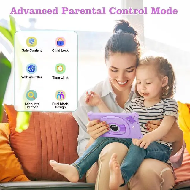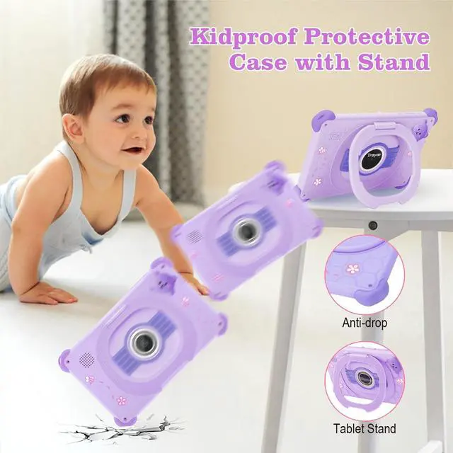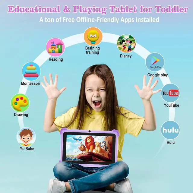 Also, you can download educational apps like YouTube Kids, ABC Mouse, Netflix from Google Play for toddler kids to explore more, Not only a great starter tablet for toddlers or little kids, also give parents a peace of mind ^^ Parents Control Mode]The tablet for kids features parents control mode, let parents set seperate profiles for each kid, add or block apps, filter contents, set screen time, provide your kids a safe digital internal world, Multiple accounts are supported, so each child can have their own personalized experience, A great gift choice for your little ones ^^ Toddler Tablet with Shock-proof CaseThe 7 inch tablet for kids 3-7 is equipped with child-resistant case that protect the tablet from falling, bumping, and squeezing, Specially designed for kids.