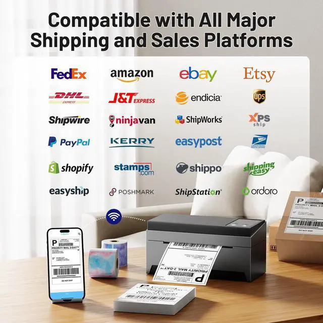 ^^ Lightning-Speed 5GHz Wi-Fi for Unmatched Printing Efficiency - The 249-WF wifi shipping label printer comes equipped with cutting-edge 5GHz Wi-Fi technology, ensuring blazing-fast and dependable connectivity for seamless printing. Print from anywhere within your Wi-Fi network's reach, and enjoy the convenience of supporting up to 10 devices connection simultaneously. This wifi thermal label printer revolutionizes work sharing by enabling cross-system, multi-device, and multi-user access, making collaborative tasks more convenient and swift than ever. ^^ Compatible with E-commerce & Logistics Platforms - Wi-Fi thermal label printer is a powerhouse that crafts labels compatible with a multitude of e-commerce and logistics Platforms.