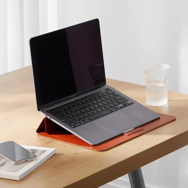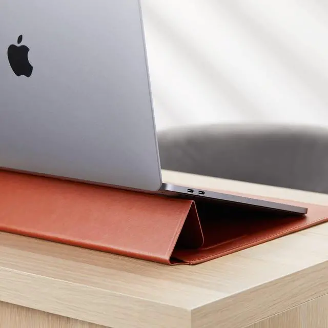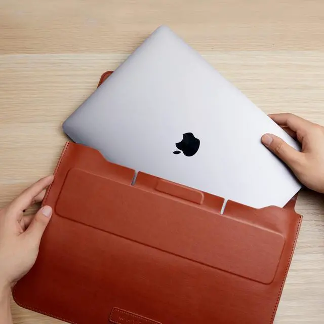 The HyperShield Stand & Go sleave for macbook pro Laptop Sleeve laptop cover for macbook pro in Tan is a slim, protective laptop case that flips up, transforming into an ergonomic laptop stand black, providing you with a pleasant 15-degree typing and viewing experience no matter where you are. This case bag for macbook is compatible with any 15-16 MacBook Pro. Our high quality vegan leather sleeve for macbook pro 13 provides the appearance and feel of real animal leather, but its free of any animal skins. The secure magnetic cover on this bag for macbook pro 13 inch 2017 locks in place ensuring your MacBook stays protected when on-the-go.