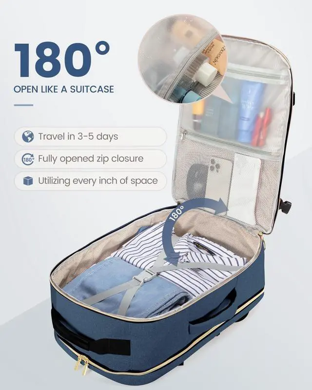 As Personal Item Airline Approved: The size of the carry on backpack is 18*14*8inch. Meets the maximum size allowed by most International Air Transport Association (IATA) flights, and can be placed in the overhead luggage compartment and under seat luggage for airlines, suitable for Spirit, Frontier, Easy Jet, Jet Blue, and other airlines. This travel backpack for women airline approved can be freely opened 90-180 degrees easily and quickly at the airport security check. ^^ With 3