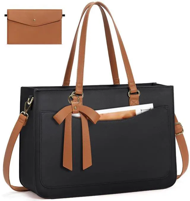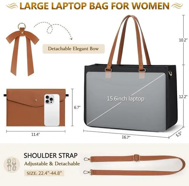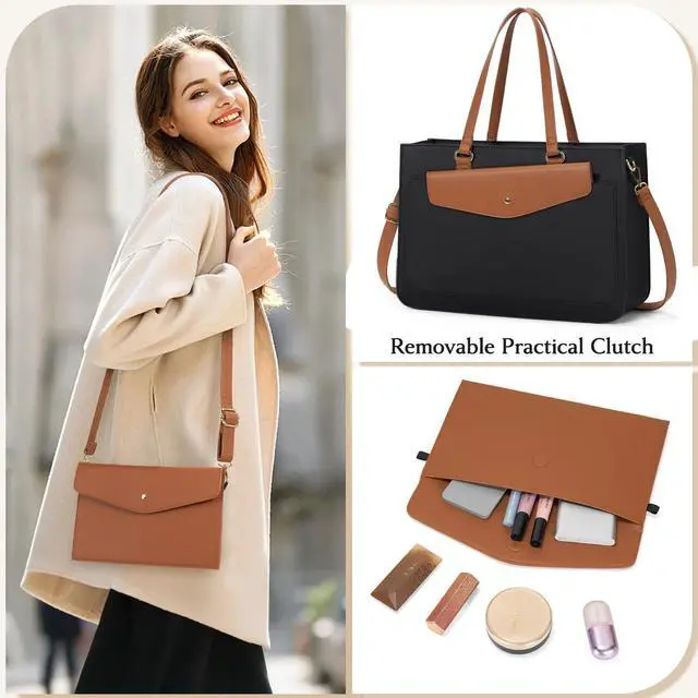 WORK TOTE BAG: This leather womens laptop bag comes with an additional clutch bag( 11.4" L x 6.7" H), perfect for storing small accessories, cables, cards, glasses and makeup, complementing the computer bag for coordination of fashion and functionality. The adjustable shoulder strap is 22.4" - 44.8" long, which can suit women of all heights and comfortable for wearing, making this bag easily transform into a briefcase for women, work shoulder bag, or laptop crossbody bag ^^