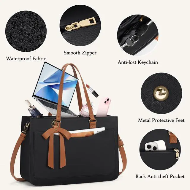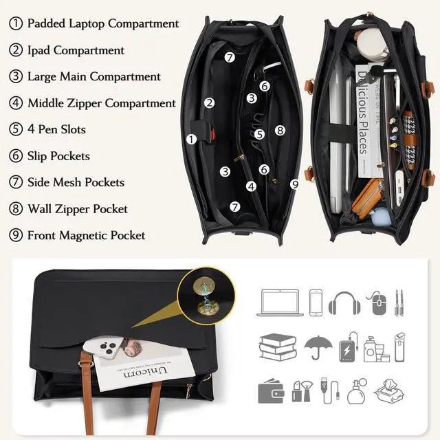 LARGE CAPACITY & MULTI-POCKETS: This work tote bags for women offers spacious storage capacity. 1 foam padded laptop compartment for 15.6" laptop, 2 large open compartments and 1 middle zipper pocket for files and books, 1 wall zippered pocket for personal belongings, multi-functional pockets with keychain for keys, pens, wallet etc, 2 inner side pockets for water bottle and umbrella. Front magnetic pocket for items easy to access and back zipper pocket for phone or passport ^^