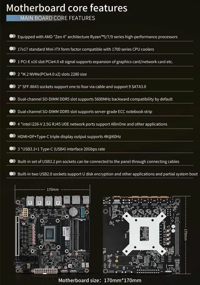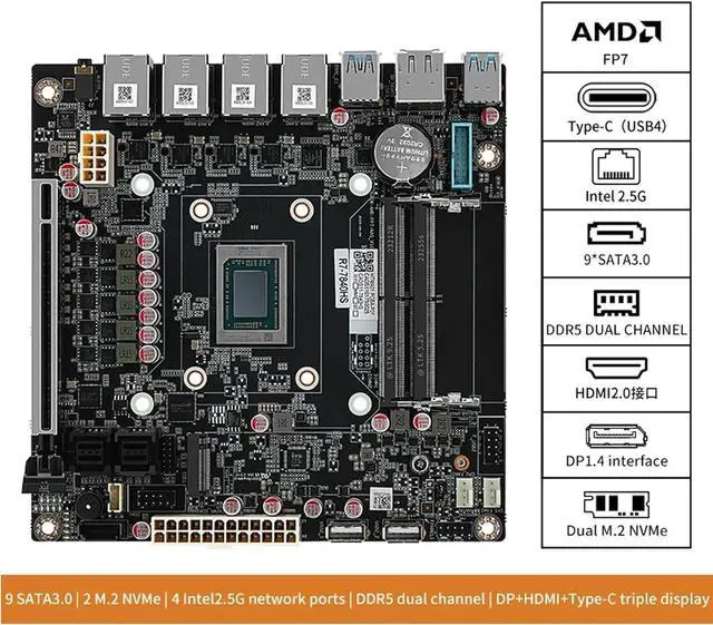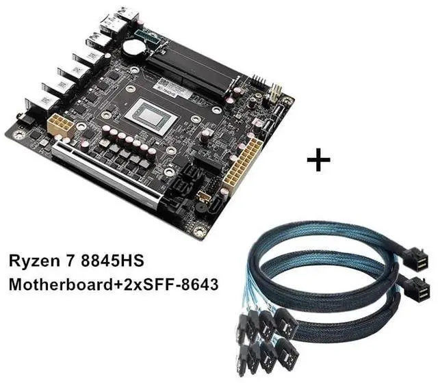 1. Must work with a good radiator 2. Must connect 24pins+8pins ATX 12V power suppy at the same time to power on. 4. Every new motherboard was tested with radiator totally before shipping, that is why copper plate seems to get traces of thermal grease. 5. Intel i226-V is a new network card, suggest to install newest version of following systems with supportable kernel: pfSense-CE 2.7, OPNsense 23. x, pfSense Plus, OpenWrt, ESXi, Proxmox 8. x, CentOS etc. Please make clear before buying. 9-Bay NAS Mini-ITX Motherboard 4x i226-v 2.5G bE Ports, R7 8845HS 8-core 16 threads, up to 5.1GH z, 2x DDR5, 2x M. 2 NVMe PCIe 4.0 *2 2280, 1x SATA 3.0, 2x SFF-8643(8x SATA 3.0 6Gb/s), Triple 4K Display, HDMI 2.0, DP 1.4, 3x USB 3.2, 1x Type-C (USB4) 40Gb/s