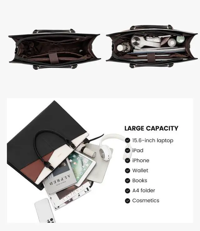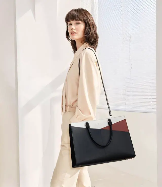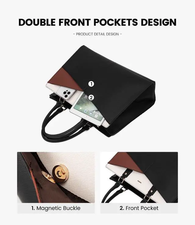 Multi-Compartment DesignThe leather laptop bag has double front magnetic pockets for fetching quickily, one padded laptop&ipad compartment, 2 slip pockets, 2 pen slots, and 1 back anti-theft zipper. Make sure your items are organized. ^^ Sturdy StructureIts unique design allows it to stand independently, maintaining stability even when fully loaded. The addition of four dust-resistant feet at the bottom not only ensures cleanliness but also provides enhanced protection against wear and tear. Choose a bag that not only reflects style but also prioritizes practicality and longevity. ^^ Perfect Size for Laptop BagDimension of the tote bag is 17" L * 6.5" W * 11.5" H;