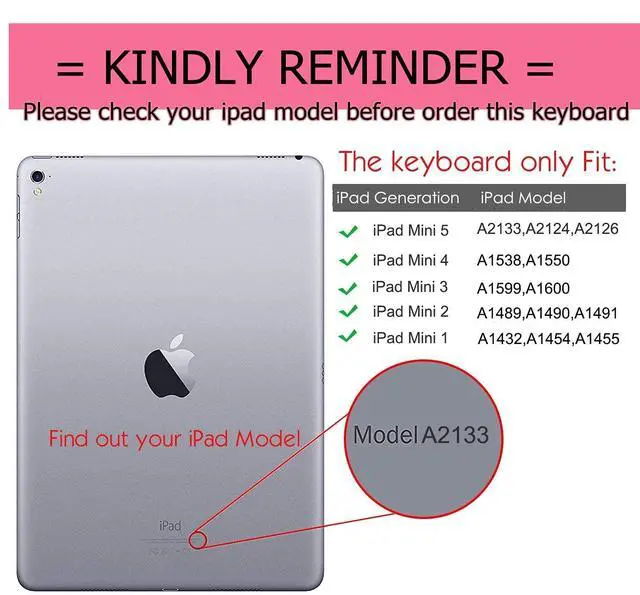 Fits iPad Model Numbers: Mini 4 [A1538/A1550], Mini 5 [A2133/A2124/A2126], mini 3 (2014 Release, A1599/A1600), iPad mini 2 (2013 Release, A1489/A1490/A1491) ^^ BLUETOOTH WIRELESS & FUNCTIONAL WELL-MADE KEYBOARD WITH PEN SLOT Made of durable PU and leather material, It does not break, slip off your device during folding, nor do the keys fail after a short period of use. A slim and lightweight profile make the keyboard case easy to use and take along in a briefcase, handbag or backpack; adding more spacious, scissor structure keys means a more relaxed and tactile typing experience for you. You get lasting value for your money. ^^ MULTI VIEWING ANGLES Built-in magnets helps fixate keyboard while typing, this will bring you excellent typing experience. Convert your iPad into a laptop and easily adjust the viewing angle to any level, perfect for working, writing, or watching videos at business, school, travel, and home.