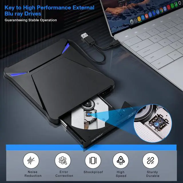 Disc Read & Write: Haiway external blu ray DVD drive, excellent transmission speed makes your work productively. Blu-ray reading speeds are up to 6x, DVDs up to 8x, and CDs up to 24x. Supports 100G disc read and write, providing expanded storage capacity for your multimedia needs. Make sure the playback software on your computer must support the Blu-ray format.