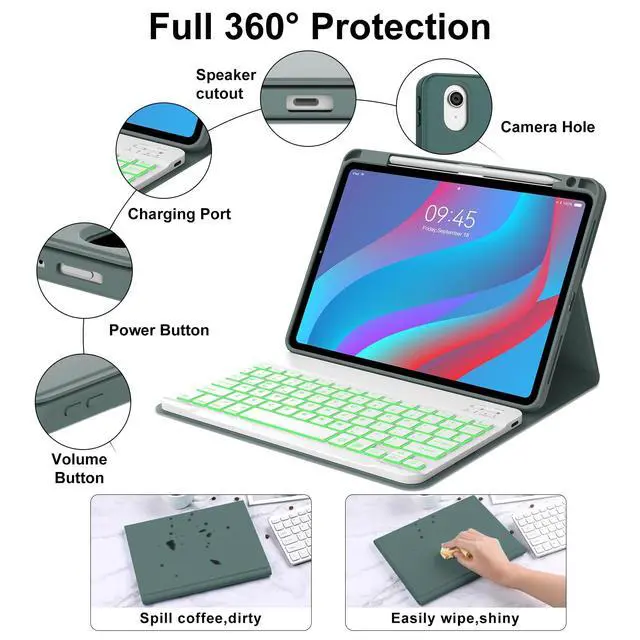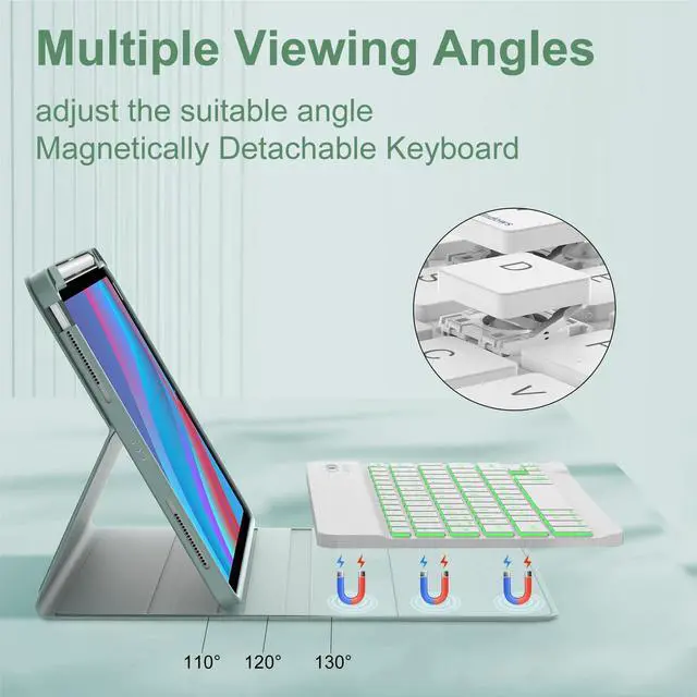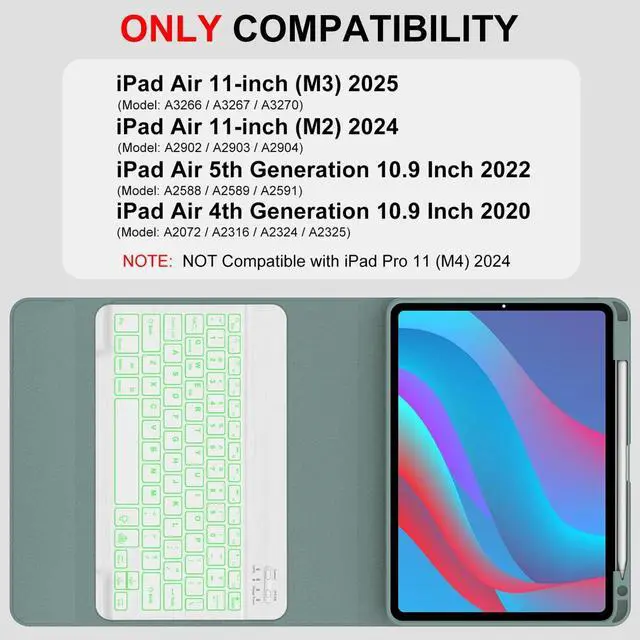 NOTE: This bluetooth keyboard case is Only Compatible with iPad Air 11-inch (M2) 2024, iPad Air 11-inch (M3) 2025, Air 5th Generation 10.9 inch 2022 (A2588/A2589/A2591) / Air 4th Generation 10.9 inch 2020 ( A2072/A2316/A2324/A2325 ). NOT Compatible with iPad Pro 11 (M4) 2024. ^^ Rechargeable and Long Life Battery - Our for ipad air 11 generation case with keyboard built-in 500mAh large capacity battery, more energy saving and lower consumption. Built-in premium Li-ion battery with energy-saving mode, The keyboard case for iPad Air with type-C charging port, 3-4 hours full charge, working for at least 75H without backlit and 5H with backlit. To save battery life, smart cover put your ipad sleep automatically when shut(Auto Wake/Sleep). ^^ 7-Color Backlight Bluetooth Keyboard - 3 levels of brightness and 7 vibrant colors make typing fun and easy, whether in the dark or in bright environments. You can choose your favorite color to bring you a different visual enjoyment. Convenient and fast Bluetooth connection allows you to use the keyboard anywhere, anytime. The ipad Air 11(M3/M2) keys are quiet and comfortable. The air 11 case with keyboard comes with power-saving mode, long periods of non-use will enter the hibernation state.