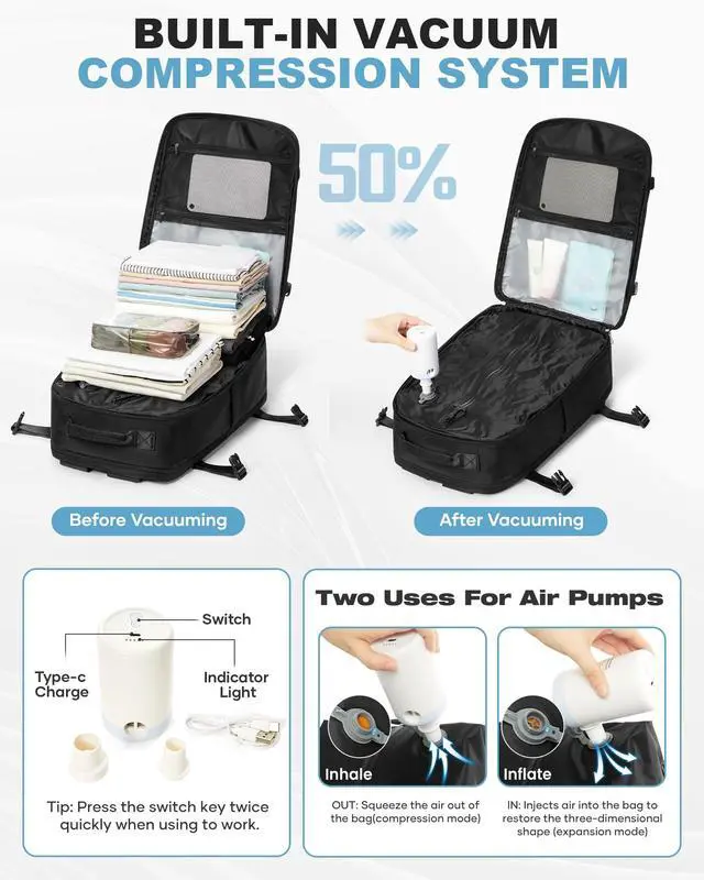 Vacuum System: Electric pump compresses clothes in the 36L vacuum backpack, reducing bulk by 50%+ while maintaining carry-on size ( 19.68" x 13.78" x 8.27" ) - fits under airline seats and overhead bins. Ultimate compression backpack for travel with built-in vacuum seal technology ^^ Suitcase-Style 180