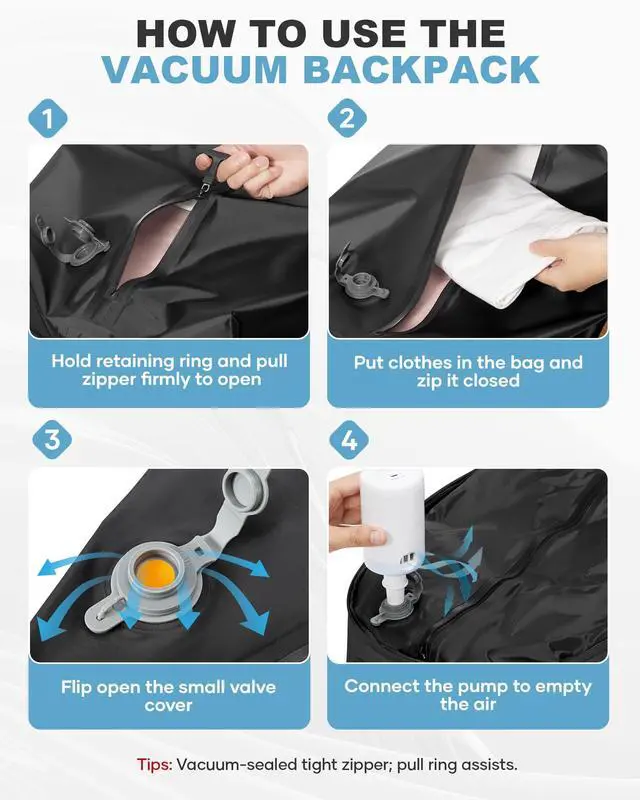 All-In-One Compression Travel System: Unlike regular easy vac pack backpacks, our vacuum travel backpack with pump integrates 5 functional zones: vacuum core, tech hub, wet/dry separation, quick-access pockets, and trolley sleeve