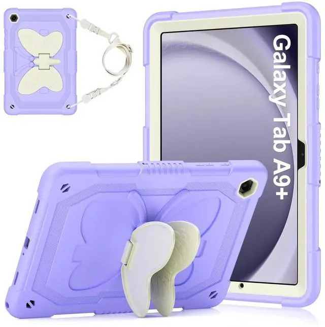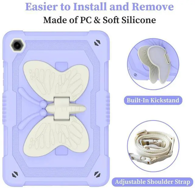 Butterfly Kickstand: It's convenient for studying, playing game, watching video with built-in butterfly kickstand, and free your hands. Not fit for Samsung Galaxy Tab A9 8.7 inch ^^ Adjustable Shoulder Strap & Precise Cutouts: You will get a retractable shoulder strap which length varies from 39 to 63 inch, provides more flexible and convenient way to use your tablet during work, study or travel. It's easy to access all buttons, controls and ports without removing the tablet from the case through the precisely-cut openings ^^