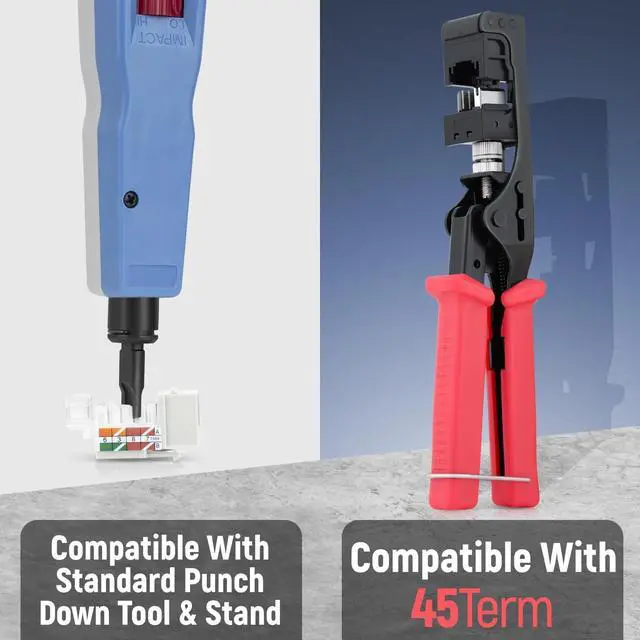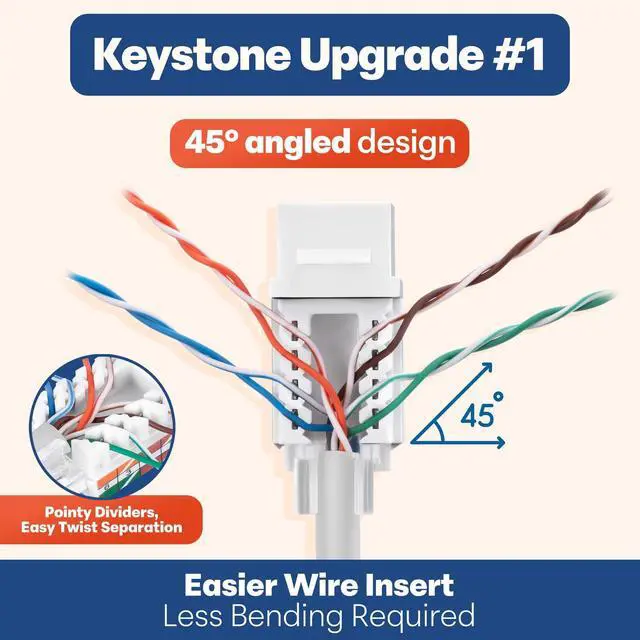 Compatibility - compatible with our 45 Angled speed termination tool - 45Term (B0BL3GS7ZY). The jacks can also work in conjunction with a standard punch down tool and punch down stand for convenience. ^^ 45-Degree Angled Wire Insert - Less bending Required, make it easier to insert the wires ^^ Strain Relief Clamp - Holds The Cable Secure, While freeing up your hands. Clamp Can be Removed on tight in-wall installs ^^ Slim Profile Design - Can be used with a patch panel, wall plate, or surface mount box with standard or slim keystone blank openings.