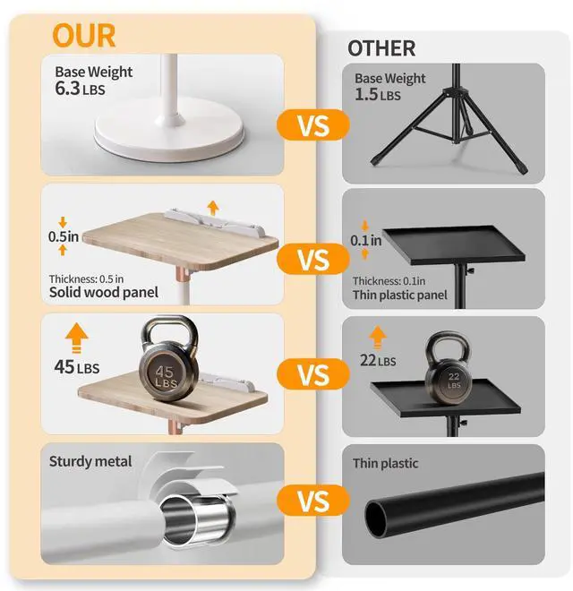 Sturdy Design: The 6.3 lb metal base with a full-cover anti-slip pad and strong support pole supports up to 45 lbs, ensuring stability even in windy conditions. The compact, round base saves space compared to traditional tripods laptop floor stand and is easy to assemble in under 5 minutes, offering convenience and comfort ^^ Wooden Panel & Book