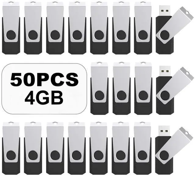 INCREDIBLE STORAGE - 50 Pack 4GB USB Flash Drives great cost performance and high quality ^^ COMPATIBILITY -This jump drive support windows7 / 8 / 10 / XP / 2000 / ME / NT Linux and Mac OS, Compatible with USB 2.0 Backwards compatible to USB 1.1 ^^ SWIVEL DESIGN - The lightweight and portable usb sticks have a nice and sleek design with a metal swivel cover on each memory stick. The end of the thumb drives has a loop for a lanyard or key ring to keep it safe or on your keys ^^ LED LIGHT- The flash drives have a tiny LED inside which is solid red when connected and flashes when it's being written to ^^ GOOD PACKAGE - 50 x 4GB USB flash drives (Black) are packed in a secure cardboard organizer box.