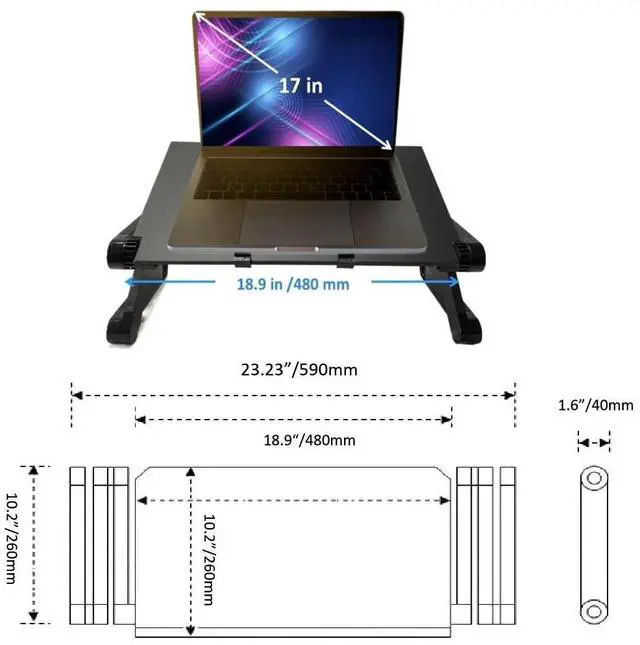 ^^ Material: Aluminum. Our desk laptop stand is made of lightweight, high-strength aluminum tray and ABS plastic auto-locking joints. It can better absorb and discharge heat for laptop to prolong the service life of laptop. ^^ Hmax = 48cm. Suitable and compatible for up to 17 inch / 17" MacBook Air/Pro, Dell, HP, Lenovo and all laptop/notebook/tablet/computer/magazine/book/iPad etc. An extra anti-slip clip on the laptop table tray is designated to clamp the stuff in place. You may use it as a book stand mount holder and TV bed tray. ^^ Smart design, highly functional with multiple uses, suitable for all settings, easy storage and portability. The multi-angle folding performance makes the desk act as computer desk, desk, book stand, snacks tray in various places like bed, sofa, floor and office, bringing in much convenience to your life. ^^ Enhanced Heat Dissipation Design is available now! The Built-in CPU fans are powered by a USB cable, 2 fans work, the upgraded design enhances the wind power. The fan blades are used to run at a high speed to achieve fast ventilation and no noise, quickly solve the computer high temperature problem, and protect your computer from harm.