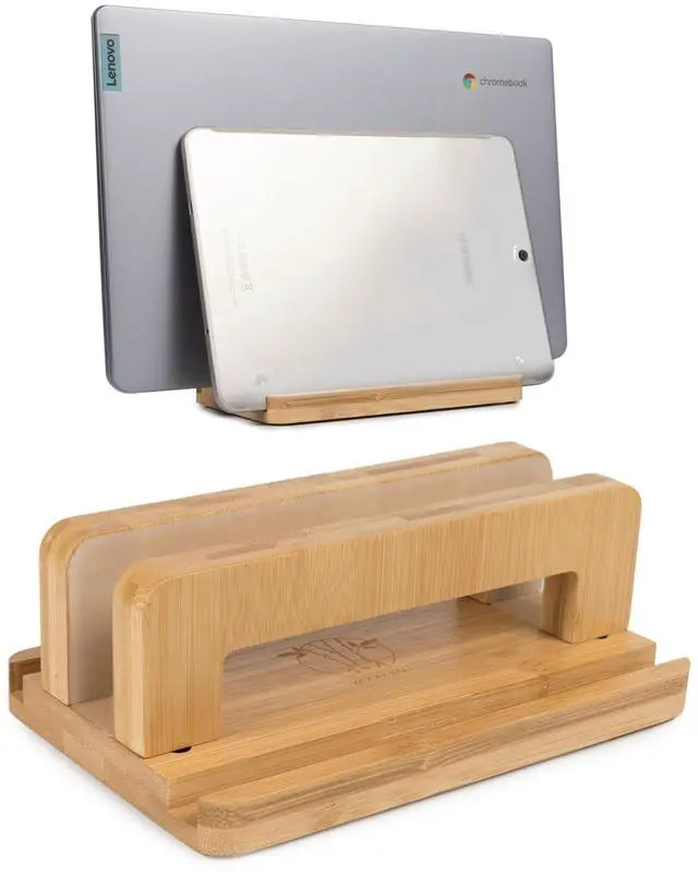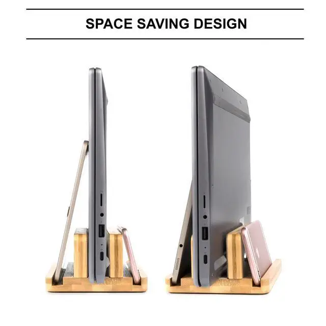 Space Saving Design: This vertical bamboo wood laptop stand for desk is designed in Canada and made using sustainable bamboo wood. Our vertical laptop stand for desk brings you a sleek and rustic laptop holder that will save desk space, keep laptops safe from spills, and reduce clutter on your workstation ^^