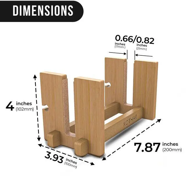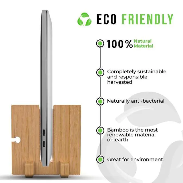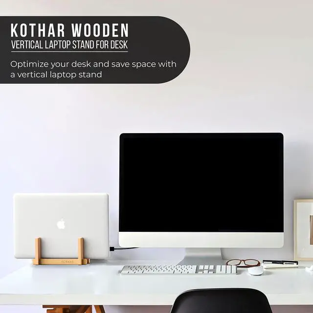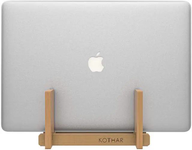 KOTHAR VERTICAL LAPTOP STANDUsually, you keep your laptop flat on your desk, but this takes up quite some space. Take for instance a 13-inch MacBook Pro. Flat on your desk it takes up 11.97 in ( 30.4 cm) to 8.36 in ( 21.2 cm). However, with the Kothar vertical laptop cradle (4" x 7") allows you to use or intelligently display your laptop while its closed and in an upright position to maximize your valuable desk space. STURDY BAMBOO FRAME & PADS PREVENTS SLIDINGThe stand is made of high quality bamboo and has a wide non-slip rubber base to make sure that your laptop stands securely on your desk.