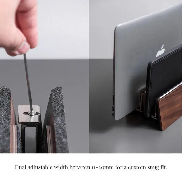Designed to optimise your desk space our vertical laptop stand is crafted with premium hardwood and stainless steel, it offers a perfect balance of weight for effortless one-handed operation while merino wool felt lining cradles and safeguards your laptop.