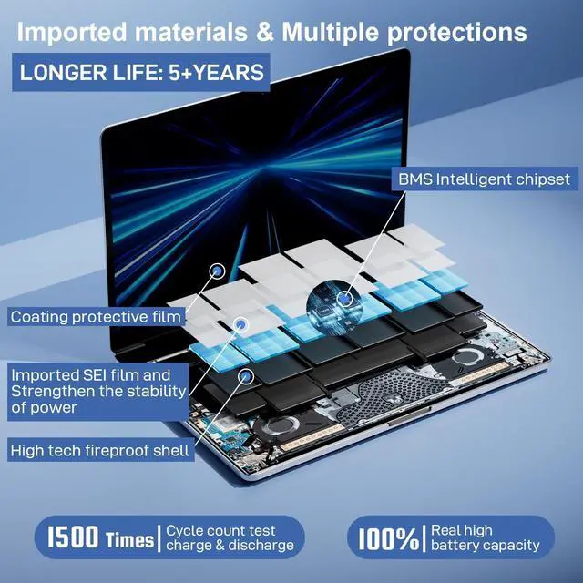 Battery Advantages: 1. More than 1500+ recharge cycles over the life of the battery; 2.100 % Safe with Upgrade chip to ensure 6-fold protection, eg. Intelligent temperature control--Over heat protection, Over charging protection, Short circuit protection..... Without (swollen battery) Damage to laptop,