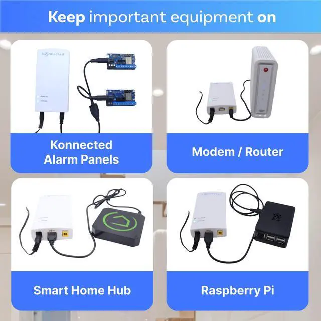 Keep everything running during a power failure with this mini-UPS 12V DC UPS power bank made especially for Konnected. ^^ This 7800mAh Li-ion battery can power your entire Konnected system for up to 14 hours! ^^ Plugs in to your 12V power adapter and automatically and instantaneously switches over to battery power if the household power fails. ^^ Also suitable for backup power for a WiFi router, cable modem, or any 12V DC consumer electronic device. ^^ Requires a 12V DC power adapter (not included).