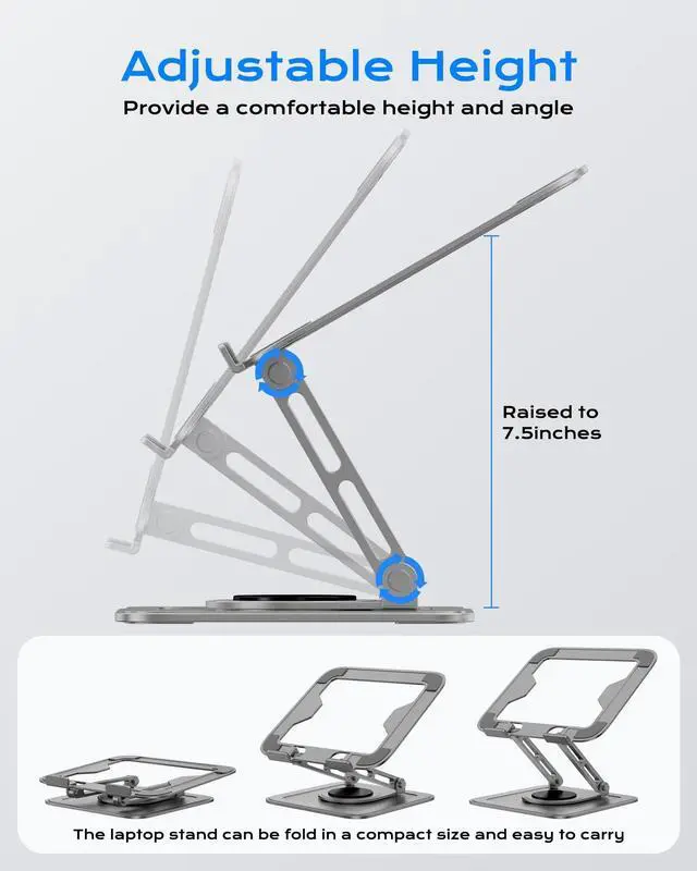 [Foldabe & Protable] - Foldable laptop stand for desk & Protable computer stand, It combines the advantages of market brackets, convenient travel laptop stand. Easy to use. Suitable for working at home, office and outdoor, improve comfort. ^^ [360Rotation] - The computer stand with 360 rotating base, 360 rotation connected with the base is more flexible, the computer stand allows you to rotate the laptop to any angle. ^^ [Stable & Durable] - The Computer stand is made of one-piece fiber metal material, which is more durable and stable than ordinary aluminum alloy computer stands.