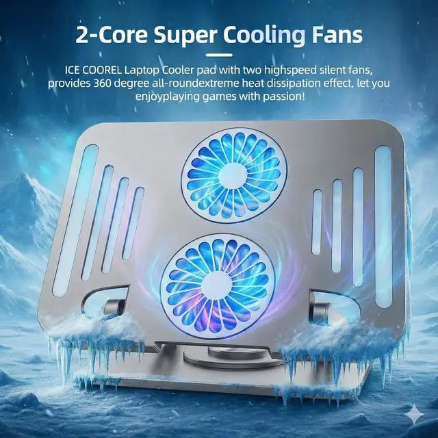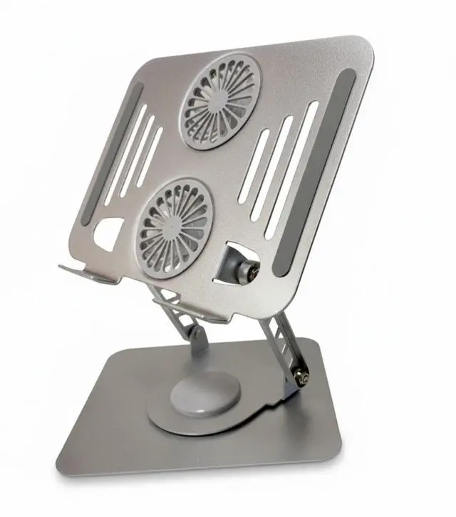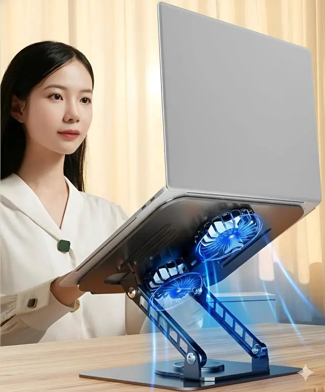 Ergonomic Height Adjustment This laptop stand elevates your screen to a comfortable viewing height, promoting a better sitting position and a more relaxed workspace during long hours of use. ^^ Efficient Cooling with Dual Turbo Fans Dual-turbo fans (or single-fan version) provide powerful and quiet airflow, actively dissipating heat to keep your laptop cool during gaming, editing, or long meetings. Maintain device performance while reducing noise and thermal stress. ^^ 360 Rotation + 180 Adjustable Tilt The stand features a 360 rotating base and 180 adjustable tiltallowing precise angle adjustments for typing, video calls, or drawing.