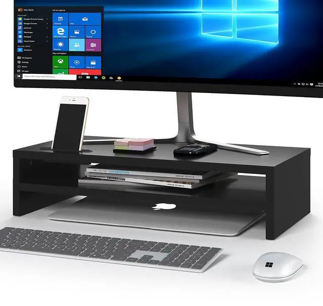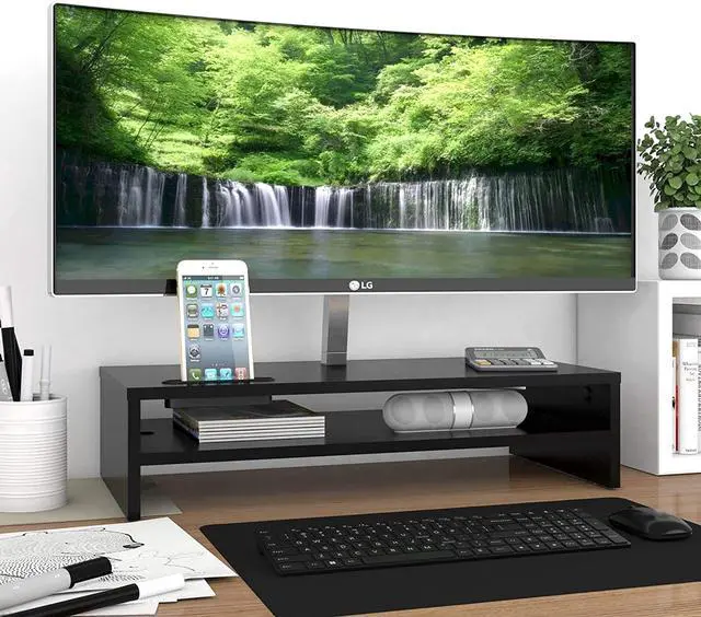 PREMIUM QUALITY MATERIALS - Made of high-quality eco-friendly MDF wood with a smooth finish, ensuring durability and a long-lasting use. This monitor stand riser provides a sturdy and reliable support for your monitor, helping you maintain a clean and organized workspace ^^ ERGONOMIC DESIGN FOR BETTER POSTURE - The 5.6 -inch height of the riser elevates your screen to eye level, reducing strain on your neck, back, and eyes. Perfect for long hours of work, this monitor stand promotes a healthier ergonomic posture, preventing discomfort and fatigue ^^ SPACIOUS STORAGE ORGANIZER - Featuring a built-in cable management system and a cellphone holder, this monitor stand riser helps you organize your workspace and keep your desk clutter-free.