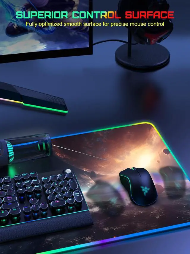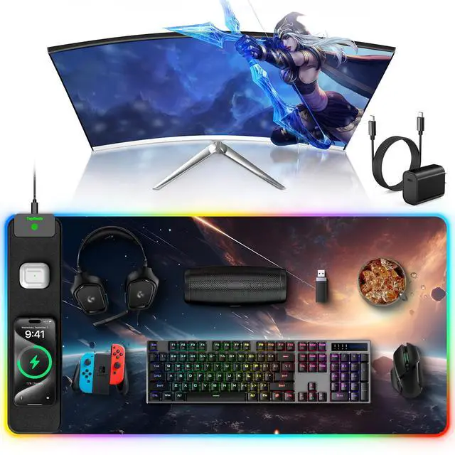 Extra Large 5-IN-1 Wireless Charging RGB Mouse Pad for Desk TopMade New Extended RGB Mousepad is 31.5" x 15.8", the extra large usable area covers your desk keyboard, mouse, and other items while gaming or working, and combines 5 functions of phone charging, AirPods charging, RGB light, desktop protector and mouse pad in one, allowing you to charge your iPhone and AirPods while using the gaming mousepad without the need for additional cables interfering with your desk, keeping your desk neat and tidy ^^ Max 15W Fast Qi Wireless Charging The round raised magnetic charging area has built-in powerful magnets that makes it easy to align the wireless charging position to charge your device, designed for iPhone 17/16/15/14/13/12, AirPods Pro 2nd/Pro/4rd/3rd/2rd (magnetic wireless charging case version only).