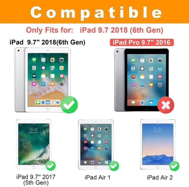 Perfectly Compatible: This case is only compatible with ipad 6th/5th/ipad air1/air 2/ipad pro 9.7 2016, not for other ipad. Please check your device and model number before purchase. Product Description. The ipad 6th generation cases features has 4 card slots for you to carry your ID, credit cards. 360-degree rotatable stand provides a more convenient viewing angle for reading, watching movies or typing while standing up. Bring more convenience to your daily life