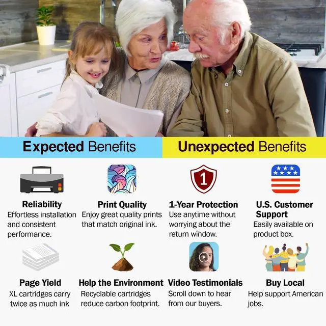 Page yield: 750 pages per cartridge (Black), 370 per cartridge (Color). ^^ Additional features and certifications. This combo pack contain the newest version smart chip which is designed to show accurate ink levels, and work with all new printers. These remanufactured cartridges do not void the printer's warranty. Cartridges are ISO 9002 certified for print quality, and ISO 14001 for environmental assurance. Cartridges can be recycled, contact us for more info.