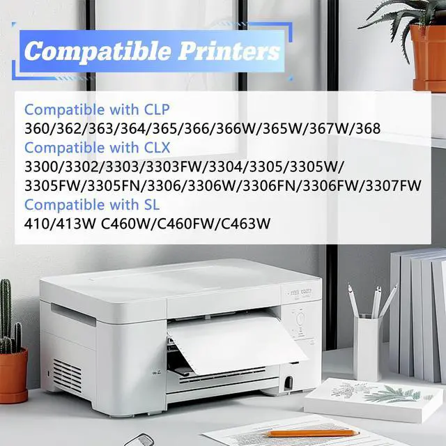 Printer Model: CLX-3300, CLX-3305, CLX-3305FN, CLX-3305FW, CLX-3305W, SL-C460FW, Xpress C460FW, Xpress C460W, CLP-360, CLP-365, CLP-365W, SL-C410W, Xpress C410FW, Xpress C410W Laser Printers ^^ The use of compatible cartridges and supplies does not damage your printer. Please do not hesitate to contact us if you have any questions, our Customer Service Team will respond Very Soon ^^ Professional production of Toner and ink, to provide you with high-quality printing supply, at a more affordable price and better printing quality. Make your office easier.