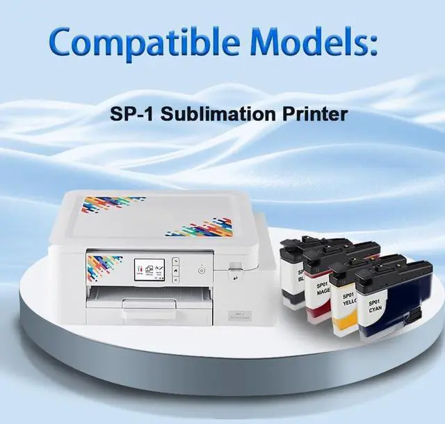 ^^ Estimated page yield: 109ml per SP01 Black ink cartridge, 52ml per SP01 Color ink cartridge at 5% coverage (Letter, A4). ^^ Replacement for Brother SP-1 Sublimation Inkjet Printer.