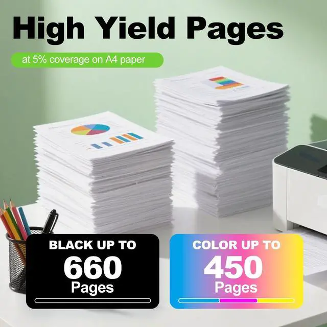 Compatible for Printers: Works with HP envy Inspire 7955e 7958e HP ENVY Photo 6220 6222 6230 6232 6252 6255 6258 7134 7155 7158 7164 7830 7855 7858 7864 HP Tango HP Tango X ^^ 660 pages for per black toner cartridge, 450 pages for per Color toner cartridgeat 5% coverage of A4 paper ^^