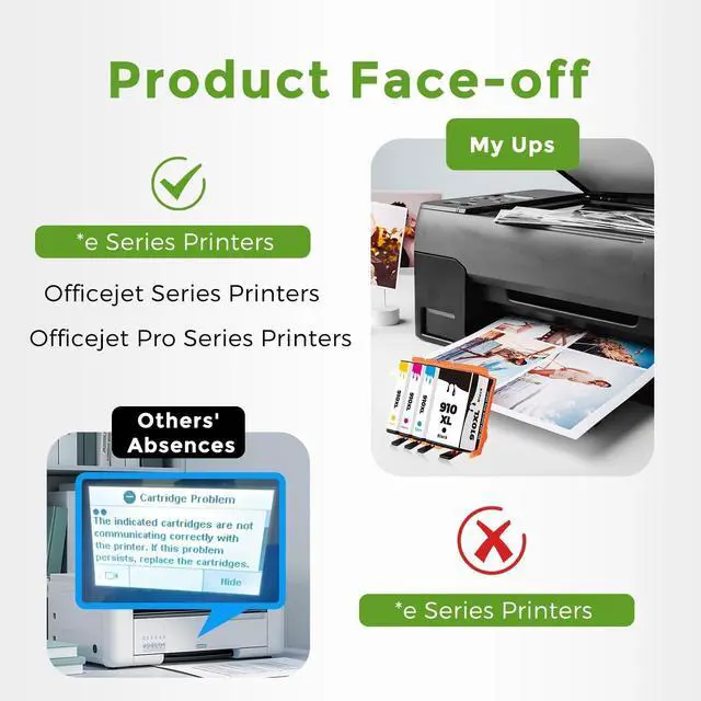 Compatible Printers: OfficeJet 8010 / 8015 / 8018 / 8022; OfficeJet Pro 8020 / 8025 / 8028 / 8035 Printers ^^ 2.5 -3x more print capacity: Up to Higher Yield 1200 Pages for 910 XL Black ink cartridge & 1000 pages for each 910XL Color ink cartridge, at 5% page coverage (Letter/A4) ^^