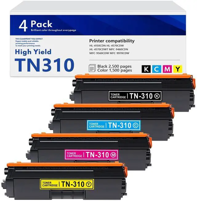 Page yield: 2, 500 pages per black TN310 toner cartridge; 1, 500 pages per color TN310 toner cartridge (at 5% coverage) ^^ Our TN310 toner cartridge, designed for use with HL-4150CDN HL-4570CDW HL-4570CDWT MFC-9460CDN MFC-9560CDW MFC-9970CDW Series printers ^^ High