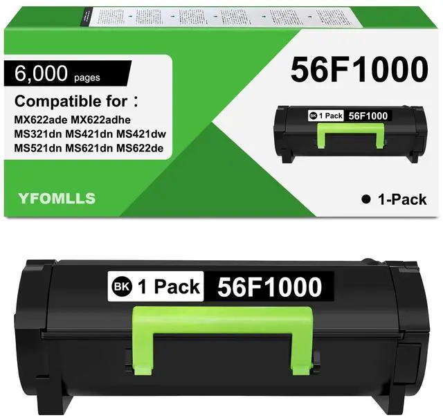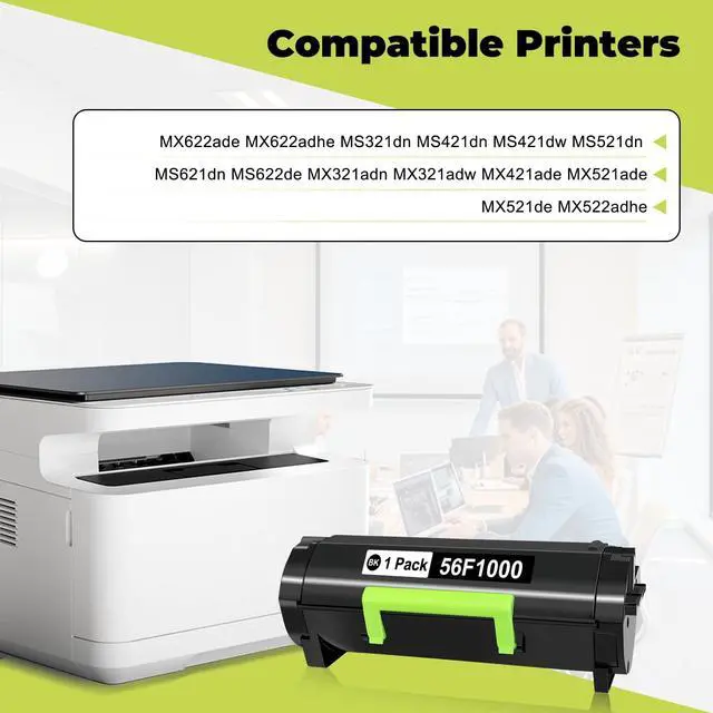 Toner Cartridge: Compatible with Lexmark 56F1000, 56F1H00 and 56F1U00 toner models, as well as Lexmark MS321dn, MS421dn, MS421dw, MS521dn, MS621dn, MS622de, MX321adn, MX321adw, MX421ade, MX521ade, MX521de, MX522adhe, MX622ade, MX622adhe laser printers.