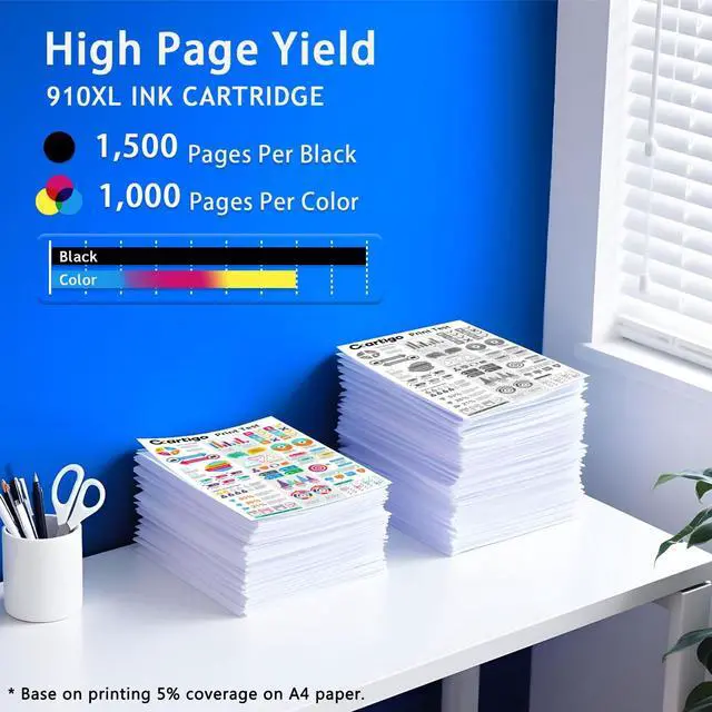 High Page Yield: 1, 500 pages for 910XL Black Ink Cartridge& 1, 000 Pages for 910XL Color Ink Cartridge (Letter A4, at 5% coverage) ^^