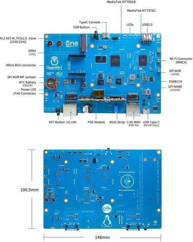 The OpenWrt One (AP-24. XY ) was designed by the folks behind the open-source, Linux-based OpenWrt operating system in partnership with Banana Pi. It ships with OpenWrt already installed.
