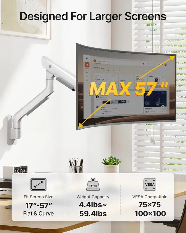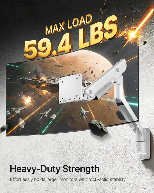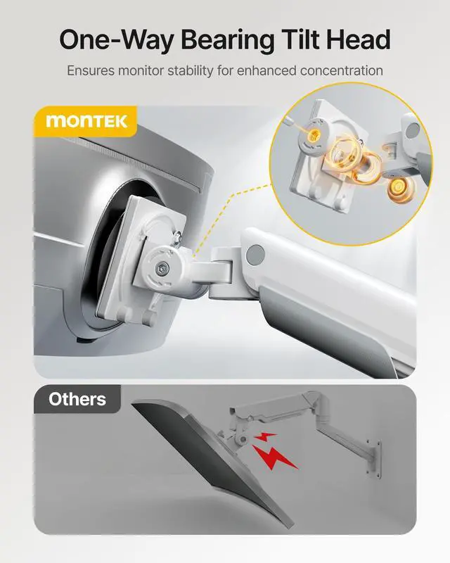 Say Goodbye to Screen SaggingTired of monitor arms that droop over time? Our advanced bearing tilt head from the mount does make sense. Its special structure allows smoother and more effortless tilt adjustmentsespecially when positioning heavier monitors upward. Once finding the perfect viewing angle, the head will effectively lock into position, providing unmatched and long-lasting stability. ^^ Ideal Choice for Ultrawide & Heavy MonitorsEngineered to confidently hold 17-57 ultrawide flat and curved monitors up to 59.4 lbs. The perfect and secure solution for your premium gaming displays, professional workstations, and heavy-duty setups.