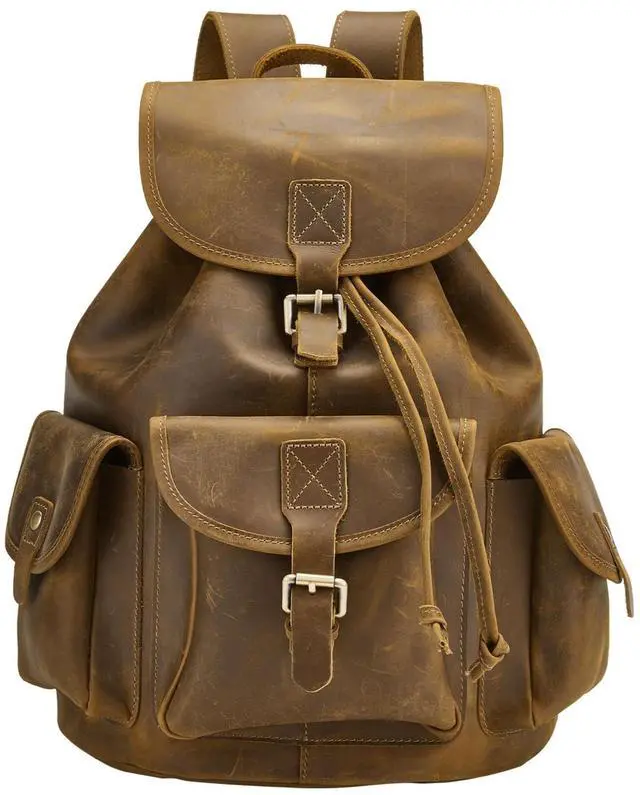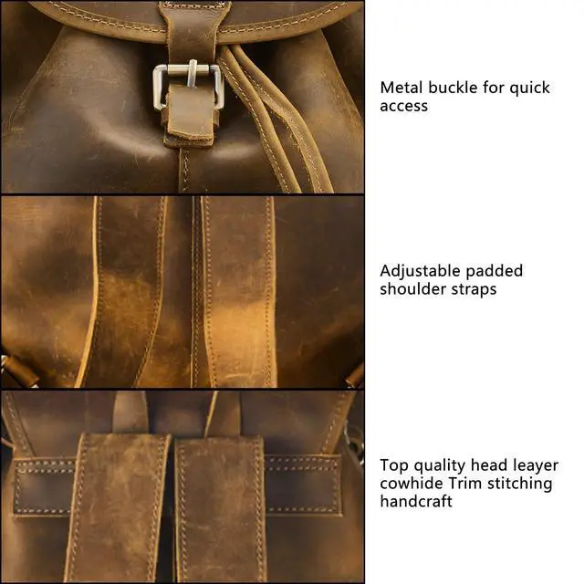 • Premium Quality MaterialThis backpack is made of top quality genuine crazy horse leather.The crazy horse leather is made of high-end top layer cowhide material, with a thickness of 2.5mm, which is solid and durable.To adapt deep and grease craft, the hand feeling of leather surface is slippy and fruity. It will comes into being allochroic effect when the hand pull and stretch the surface. Longer using, more shiny for the surface patina.