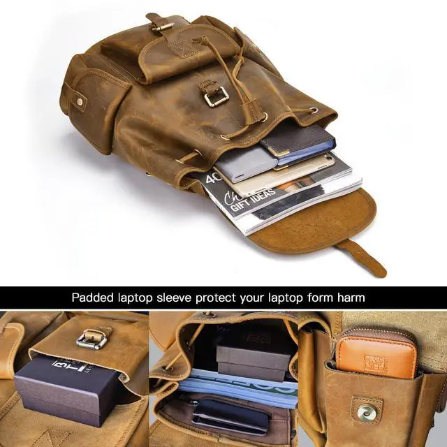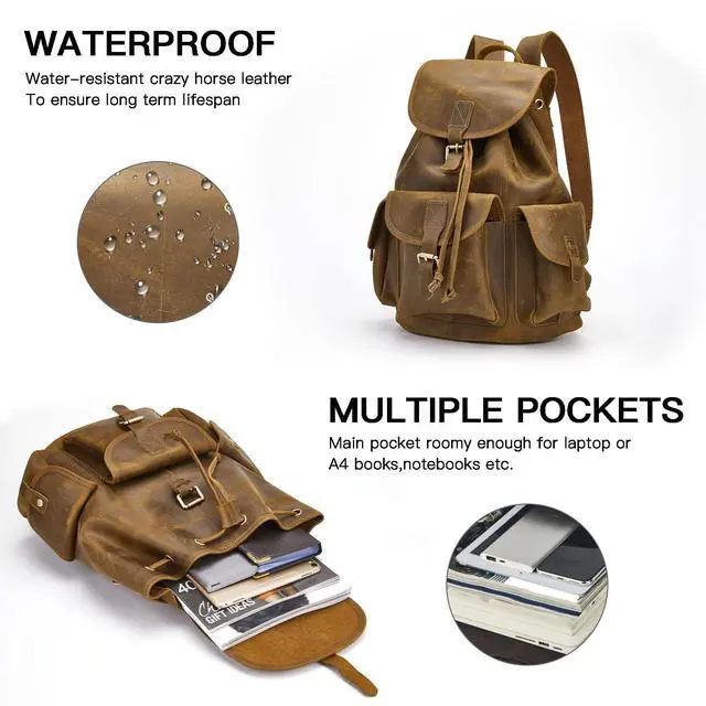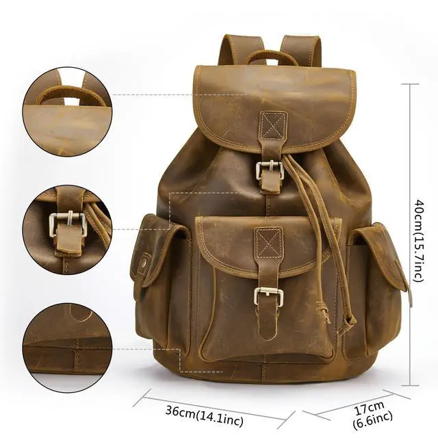 Premium Quality MaterialThis backpack is made of top quality genuine crazy horse leather. The crazy horse leather is made of high-end top layer cowhide material, with a thickness of 2.5 mm, which is solid and durable. To adapt deep and grease craft, the hand feeling of leather surface is slippy and fruity. It will comes into being allochroic effect when the hand pull and stretch the surface. Longer using, more shiny for the surface patina. ^^ Backpacks DimensionsThis backpack dimensions is 14 (L) * 15.7 (H) * 6.7 (W) inch which can fit 14 inch and 13 inch Macbook/Laptopsuch as for Dell HP, Asus, Lenovo, Acer, Samsung, Sony, MacBook, Notebook.