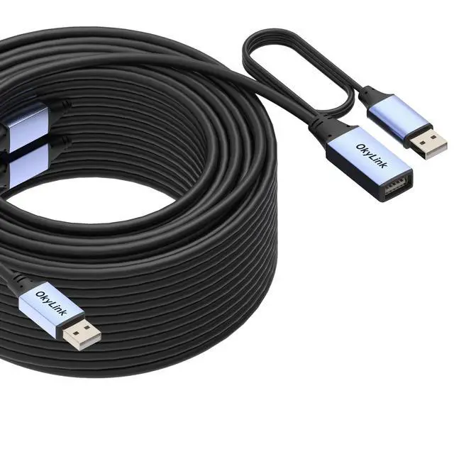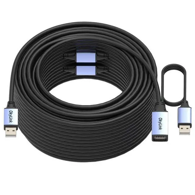 8ft) maintain full 480Mbps performance without requiring external aux power. Perfect for desk setups and shorter runs. ^^ Long-Length 1550M ( 49.2164 ft) Optional External aux power Active USB A to A extension cables 15 meters and above ( 49.2 ft+) include a built-in 0.8M / 2.6 ft USB-A aux power cable at the device end. Connect to a wall charger, USB hub, or nearby USB port for enhanced stability with high-aux power devices or long-distance setups. ^^ Durable Construction & Broad Compatibility Reinforced aluminum alloy connectors and high-strength PVC cable provide durability, anti-interference, and heat dissipation.