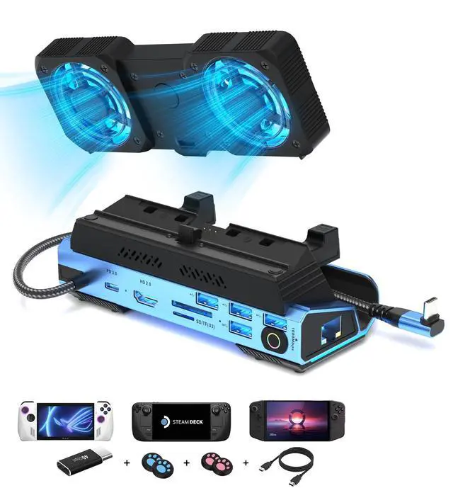 Handheld Console Dock: Transforms your Steam Deck OLED/ASUS ROG ALLY/Legion Go's USB Type-C into 9 ports: HDMI 2.0 (4K@60Hz), Gigabit Ethernet (1000Mbps), 1 USB 3.0 (5Gbps), 3 USB 2.0, USB Type C PD 3.0 (100W), SD/TF reader, 1 Key to change Screen, this handheld console dock combines hub, stand base, heat sink, 40Gbps Type C adapter, 4 Cpas, 1 HDMI cord in 1.5M, it is a professional handheld gaming dock station. ^^ Removable & 3 speed Adjustable Cooling