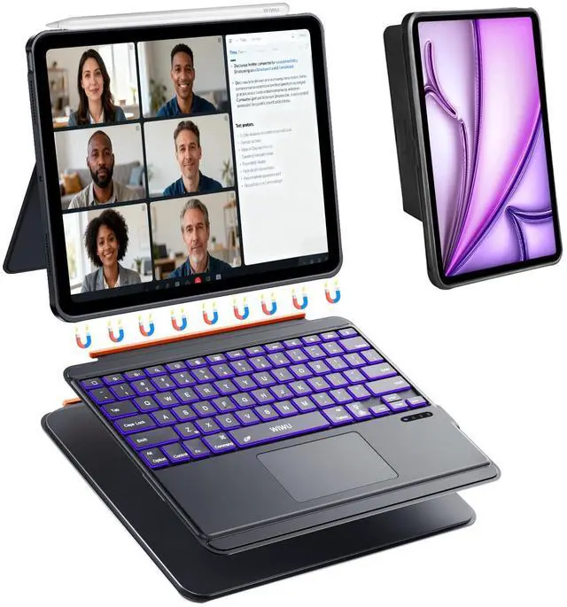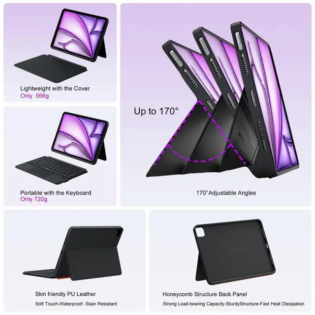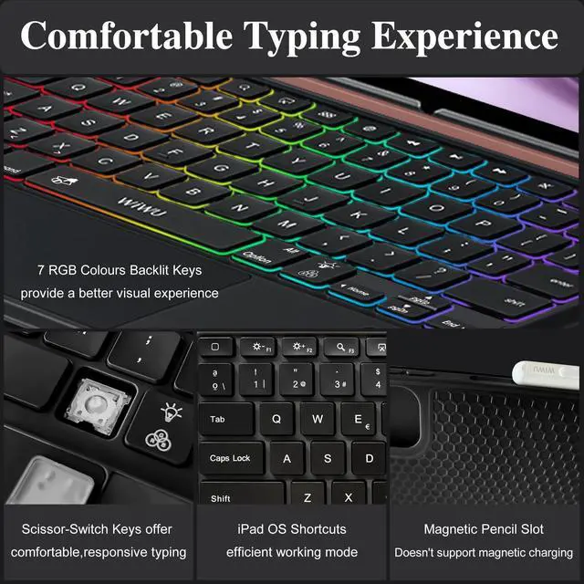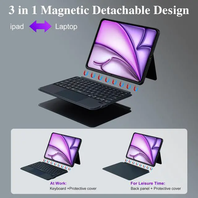 Design: Detachable Magnetic Keyboard Case Stand, strong magnets secure stable attachment. Instantly transforms iPad case into a typing keyboard or adjustable viewing stand. Suitable for movies, video calls and meetings. Ideal for office, travel, and outdoor adventures. PU Leather full-edge coverage, protects tablet from drops and scratches ^^ Slim Design &