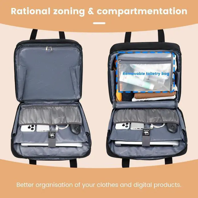 EXTRA LARGE SEPARATION SPACE: Three individually separated oversized spaces with luggage space to hold and secure your clothes, shoes and more, and a waterproof pocket for separate overnight toiletries. It can store 15.6 -inch laptops and other electronic products, and has a thick bumper compartment to protect your electronic products. Can store your books, documents, certificates.